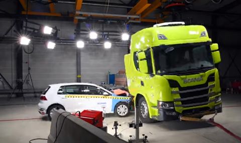 Шведският производител на камиони Scania провери здравината на акумулаторите на новия си електрически влекач, като блъсна в тях Volkswagen Golf. Краш тестът е трябвало да потвърди резултатите от компютърна симулация.